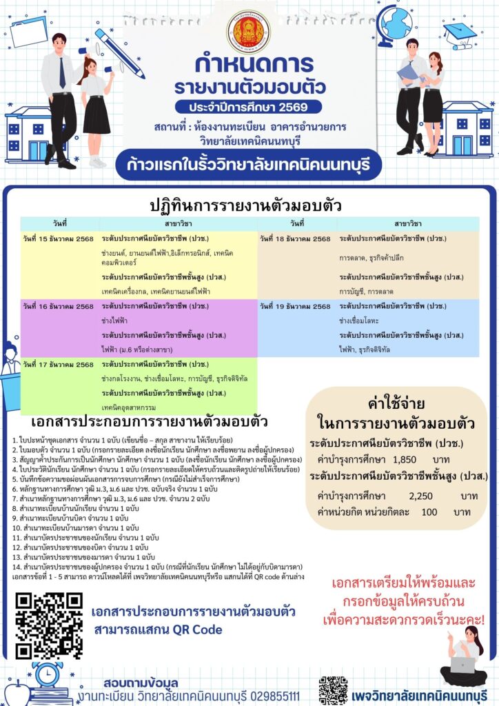 - ❁ ประกาศรายชื่อนักเรียน นักศึกษา ผู้มีสิทธิ์เข้าศึกษาต่อ ในระดับ ปวช. และ ปวส. ประเภทโควต้า(พิเศษ) ประจำปีการศึกษา 2569